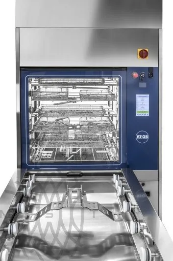Моечная машина AT-OS AWD655-15A высокой загрузки для дезинфекции инструментов и вспомогательных медизделий.  Автоматическая слайдовая дверь на 15 корзин стандарта DIN ~ 450 литров.