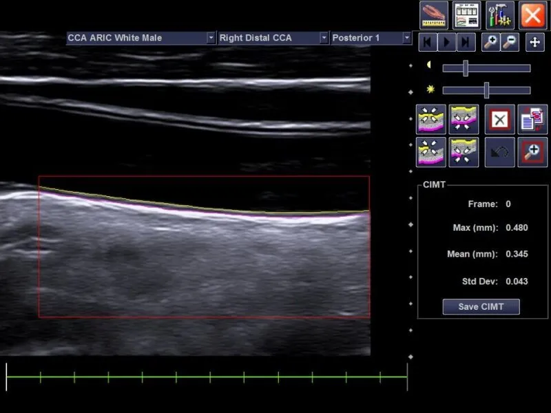 Предоставляет возможность измерять результаты исследования толщины сонной артерии (CIMT). Информация предназначена для того, чтобы предоставить простой инструмент для уведомления пациентов об относительном состоянии их сердечно-сосудистой системы.