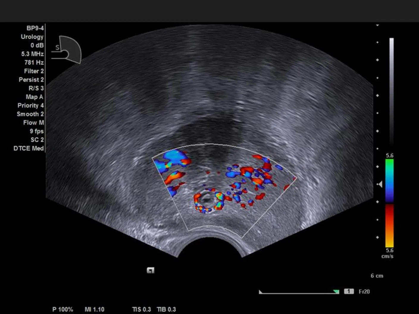 - Позволяет выделять цветом характер кровотока в ROI (области интереса) Обычно применяется в сердечно – сосудистых исследованиях. Кровяной поток, идущий от датчика, отображается синим цветом, к датчику – красным. Сине-зелено-желтым цветом выделяется турбулентный поток.